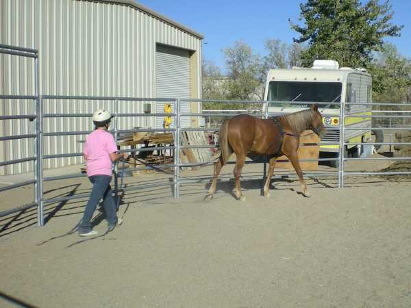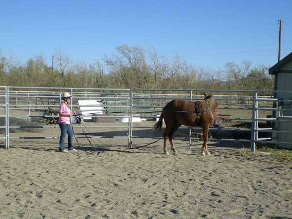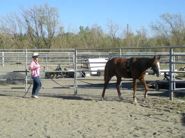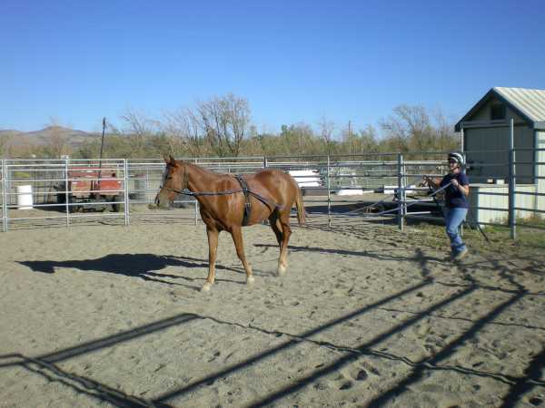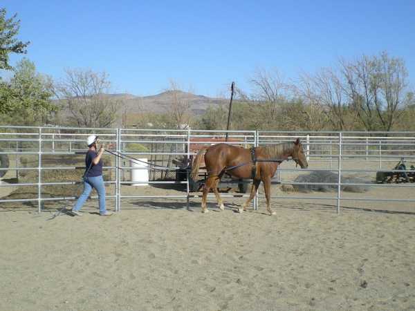 Brooklynn is a two year old mustang from the Slick Gardner rescue adopted by Meghan McCoy. Meghan and her mom, Dana, have put Brooklynn through a lot of general basics; lead line and ground schooling, circling, working obstacles, etc., so she is very curious and not afraid of much. In fact it was challenging to give Brooklynn new things to tackle. We decided to try Brooklynn in a circingle and driving lines to see how she would handle it, plus ground driving is a good preparation for eventual saddle work. Here are how things went.