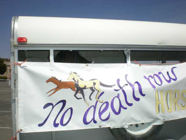 On a particularly beautiful April day about 20 advocates assembled outside the Nevada Republican Convention in Reno to protest plans by the Nevada Department of Agriculture to remove a historic herd of horses from the Virginia Range near Virginia City, NV. Advocates carried signs and a number of horse trailers circled the convention venue decked out with flags and signs with the theme, "No Death Row Horses."