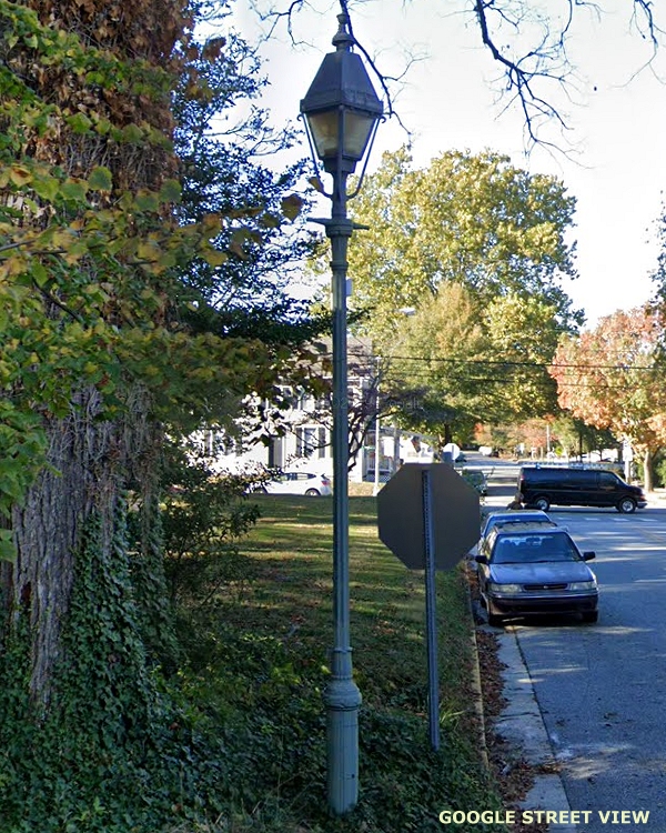 (This is Part Eleven of a Street View tour of vintage and historical street and pedestrian lights for enthusiasts to view and in hopes of encouraging cities and towns to preserve some of these old luminaires and electroliers, or at least choose replicas that reflect the character of historic districts when modernizing their lighting. The images link to Google Street Views to make it easy to "look around" if an image interests you. The photos begin in