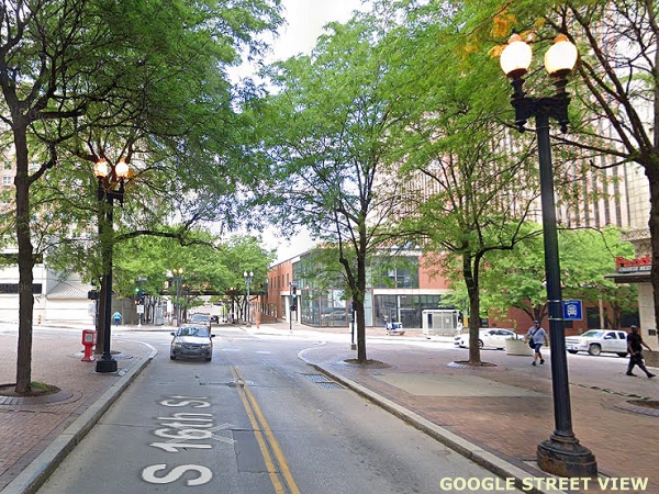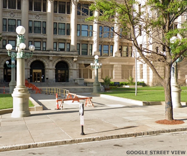 Opal glass globes on interesting posts. (Robert S. Vance Federal Building, Fifth Ave.)