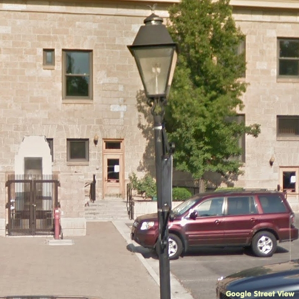 A lone opal glass on a column at the entry. (Attorney General's Office, Carson Street)