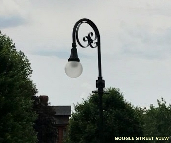 (This is Part Eighteen of a Street View tour of vintage and historical street and pedestrian lights for enthusiasts to view and in hopes of encouraging cities and towns to preserve some of these old luminaires and electroliers, or at least choose replicas that reflect the character of historic districts when modernizing their lighting. The images link to Google Street Views to make it easy to "look around" if an image interests you. The photos begin in