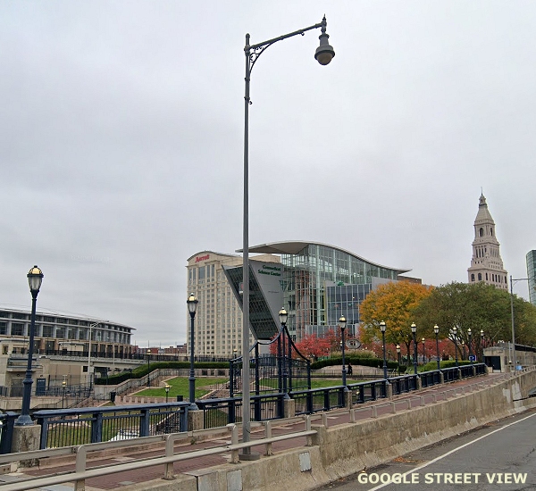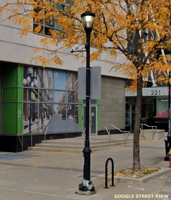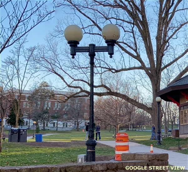 (This is Part Twenty of a Street View tour of vintage and historical street and pedestrian lights for enthusiasts to view and in hopes of encouraging cities and towns to preserve some of these old luminaires and electroliers, or at least choose replicas that reflect the character of historic districts when modernizing their lighting. The images link to Google Street Views to make it easy to "look around" if an image interests you. The photos begin in