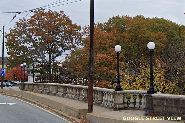 Opal glass posts at bridge entrances, 1907. (Watertown Bridge, Galen Street, Charles River)
