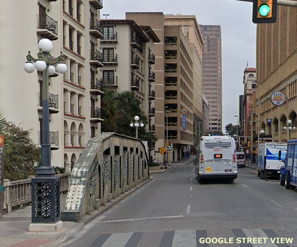 Two arms removed to make room for the building. (Navarro Street Bridge, San Antonio River)
