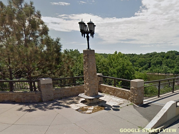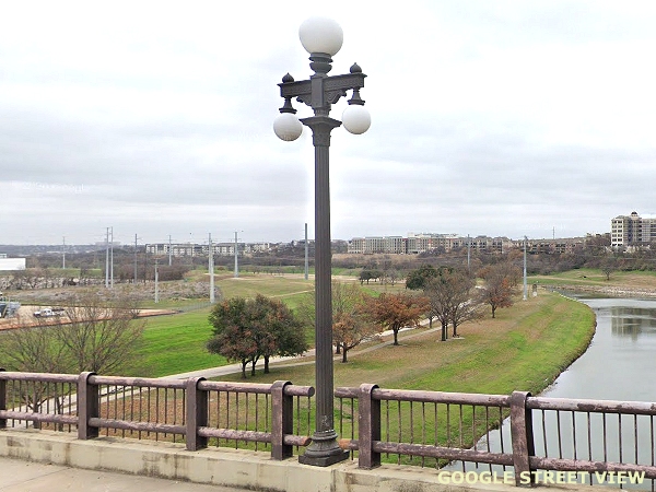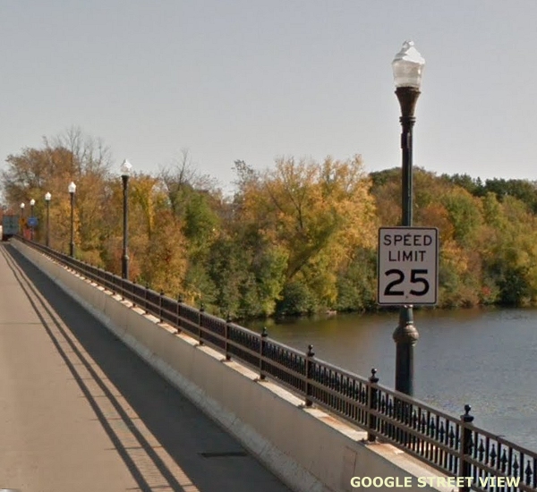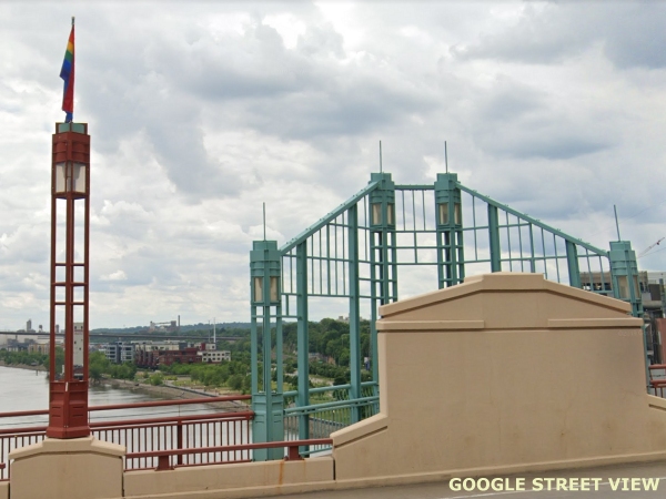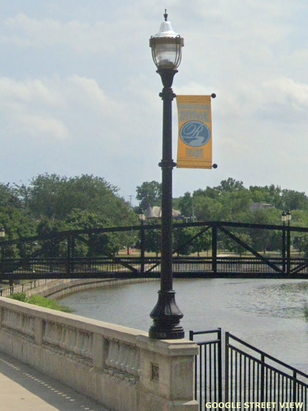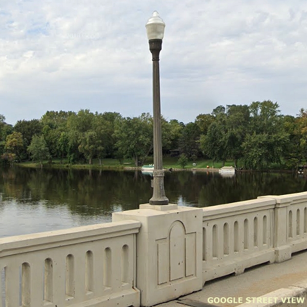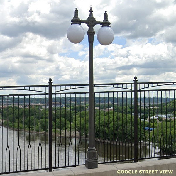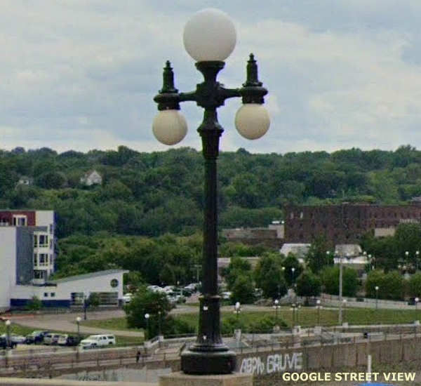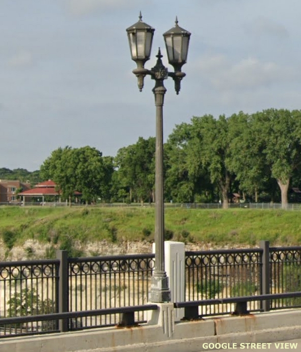 Mid-century roadway lighting, reproductions for the pedestrian walkway. (Meriam Street Bridge, Mississippi River)
