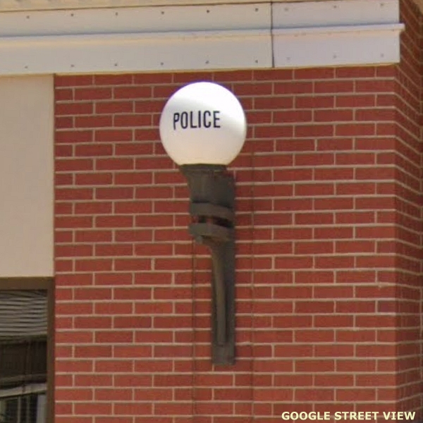 An iconic POLICE globe in an art deco sconce (N. Monroe Street)