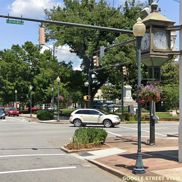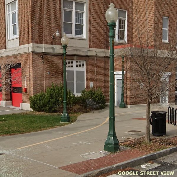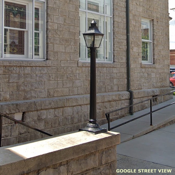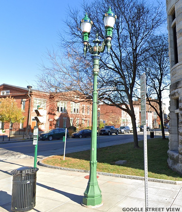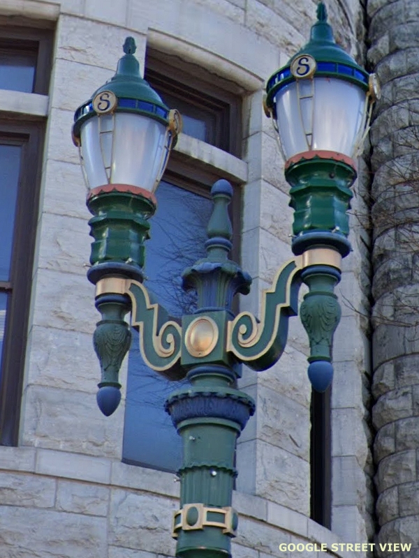 (This is Part Thirty One of a Street View tour of vintage and historical street and pedestrian lights for enthusiasts to view and in hopes of encouraging cities and towns to preserve some of these old luminaires and electroliers, or at least choose replicas that reflect the character of historic districts when modernizing their lighting. The images link to Google Street Views to make it easy to "look around" if an image interests you. The photos begin in