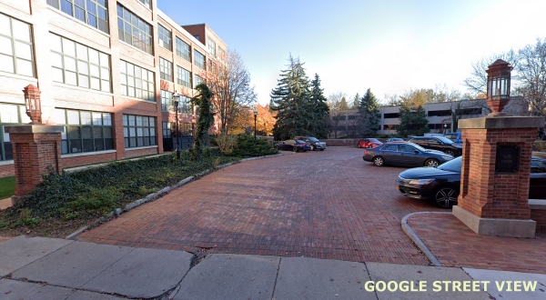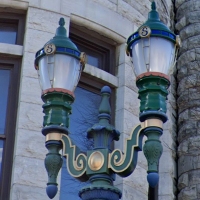 Lanterns on fancy wrought iron posts. (Adult learning center, Kanawha Street)