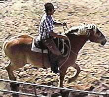This next maneuver is a little different. In this case I've run the halter lead from the right, over her nose to the left. I am "holding" her with contact from my left leg and asking her to bend her neck without shifting her weight. If you notice her feet, she is stepping out both in front and in behind, pivoting around me as the dead center of the pivot. This maneuver is good for balance and will help her learn to bend around my leg. |