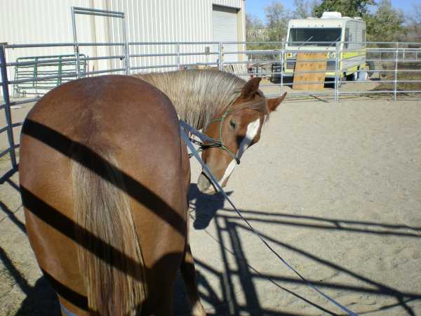 Brooklynn is a two year old mustang from the Slick Gardner rescue adopted by Meghan McCoy. Meghan and her mom, Dana, have put Brooklynn through a lot of general basics; lead line and ground schooling, circling, working obstacles, etc., so she is very curious and not afraid of much. In fact it was challenging to give Brooklynn new things to tackle. We decided to try Brooklynn in a circingle and driving lines to see how she would handle it, plus ground driving is a good preparation for eventual saddle work. Here are how things went.