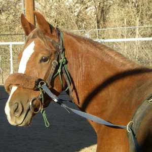 We rigged Brooklynn for ground driving, this time letting her also carry a headstall and snaffle bit. Once she got through playing with the bit we went out into the round pen where she worked quite well for Meghan, starting out better than she finished the day before. It quickly became clear that Brooklynn was ready for a larger workspace.