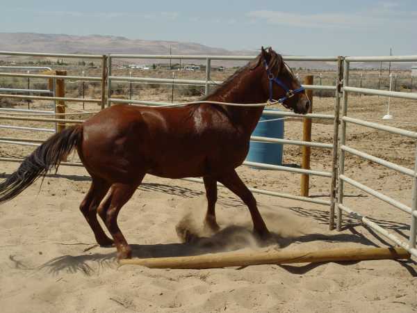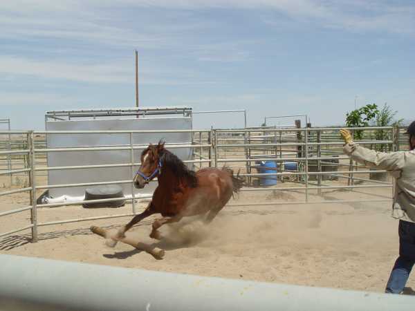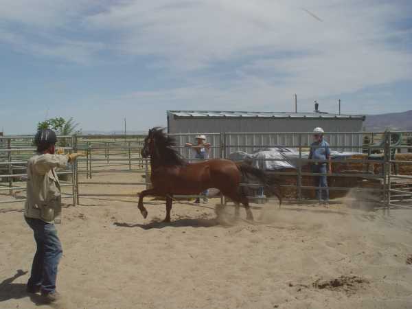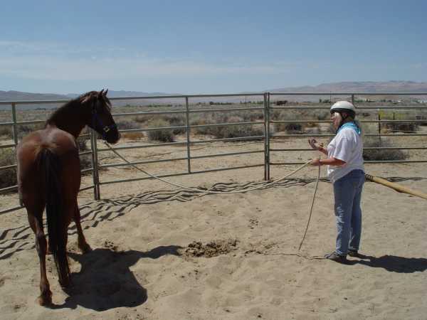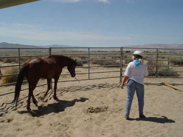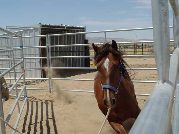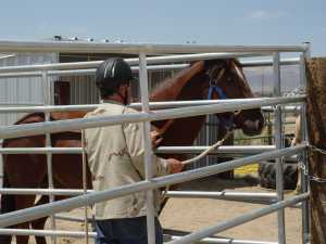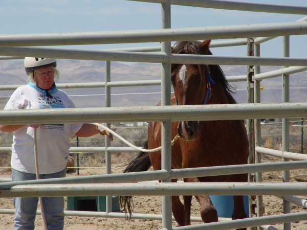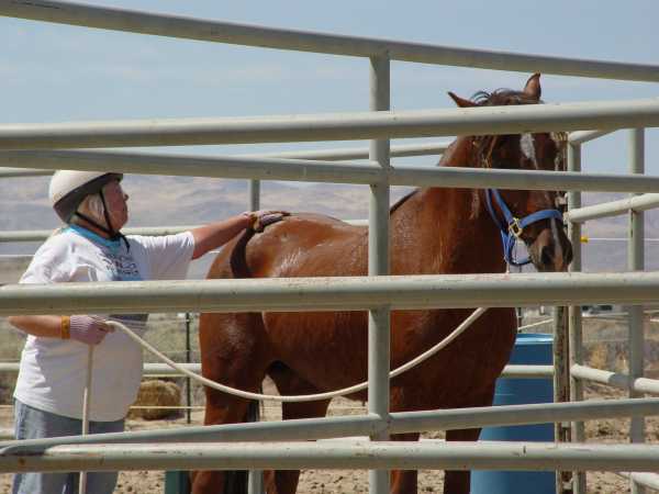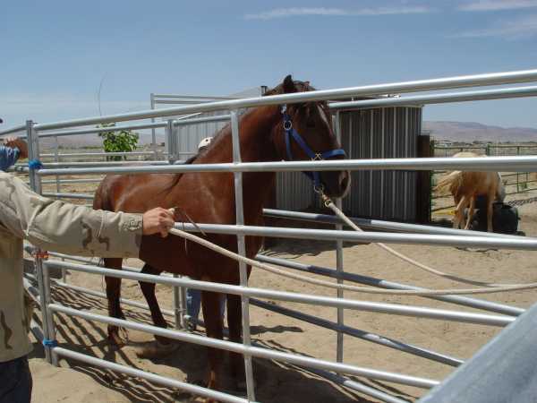 It was time to get Kruzer out on the lead line. This was a little difficult since Kruzer absolutely didn't want anyone or anything touching his face. Lee and Kathy worked with Kruzer in the squeeze and reached the point where we could attach the lead line without a struggle. Once out on the line Kruzer had some real issues with the lead "chasing him" if he got busy, but it didn't take him long to figure out that standing quietly was the best way to deal with the situation.