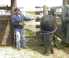Joyce North adopted an older stud off the BLM Satellite TV adoption. He was gelded a month prior to being released to Joyce, however he was definitely a stud and is built like a locomotive. As soon as the weather permitted, Joyce brought him down to KBR to let us work with him. (All of the photos on this page were taken within 2 hours of entering the pen to work with him.) Max arrived late in the day so we gave him the night to acclimate himself to the mustang pen. I went in the next morning to see what he was up to. While he would let Joyce touch him during the time he was with her, he would have nothing to do with me, turning his butt toward me in a defensive posture. He seemed basically mellow in nature so we opted to be as non aggressive as possible but still stay in charge. I started out using the bamboo pole with him which he had seen already at Joyce's. He was very quiet with the pole but I had to scratch him from the rear. He would turn away if I approached his shoulder. Basically we don't want horses to turn their butts toward us but in Max' case he was not aggressive and as soon as I had him used to my presence, I could fix the butt problem. After a few minutes with the pole, I started moving him quietly around the mustang pen. I moved him off by twirling the progress string and I would adjust my pressure so that he would not get stuck in the corners and feel the need to swing his butt around. Occasionally he would stop and position himself with his butt toward me and I'd just flick him on the rump with the progress string until he would move off again. Once this behavior was working, I would reward him with scratches from the pole, this time positioning myself at the shoulder. One thing we noticed early on is that Max would keep people on his off side. If I tried to get to his on side, he would be apprehensive and try to keep me in his right eye. We've learned that right from the start these horses have to accept you on both sides or gentling them will be very tricky. Sharon started doing things on the outside of the pen on one side to catch his attention while I positioned myself on the other. No matter what Max did, he had people on both sides. Then I sent him around the pen counter clockwise at a walk for several laps, then reversed him several times. Within about 20 minutes he was at least as easy, if not easier, to approach from his on side as his off side. Now that I could get some position on his shoulder, I used the pole to drop on a sliding neck loop. He yielded pretty well to neck pressure. If I pushed him a little too hard and he lost his confidence, he'd still turn his butt toward me so I just gently slapped the lines across his rump (from a safe distance) and we ground drove a little. During this workout we would let Max take some time outs when needed by putting his head into the chute. At one point I quietly slid the neck loop lines behind his legs and let him get used to the feel of the lines. Then I started touching him at the shoulder, making nice scratching motions. I also started grooming him with the brush. I tried to stay within his emotional tolerance and he kept real quiet. Periodically I would adjust the lines on his legs so that they tapped him in different locations. A couple of times he kicked at the lines but he accepted them. We asked him to back out, worked him a little on the lines, then pulled the lines and "herded" him back to his safe spot. At this point he would let me rub, scratch and brush him with nothing on him to discourage his backing up. Max was a little less comfortable letting me groom him from his off side, but he did try. By now the session had now lasted about two hours, he would move off when asked, yield and turn, let me touch him and responded to the lines. This was enough for one day. |