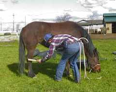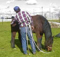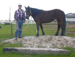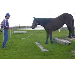 Day 4: We had showers most of the day. I spent most of the morning putting some PVC pipe over the high tensile wire on the back fence. One never knows when a mustang or two might break loose and head for the "invisible fence." I also played with Patience some, putting her halter on and taking it off a bunch of times. She still didn't like it much, but at least she was starting to stand quietly. Mikey, who was loose grazing, watched the goings on with Patience, his face pressed against the view slot in the front of "Mustang Manor." I used click-reward for most of this exercise and fortunately Patience took a liking to apple wafers as I had run out of carrots. After lunch I went back out and checked on Patience. She seemed pretty calm. It was kind of a misty rain and nobody was around so I figured I'd see how she handled the great outdoors. First, in the paddock we refreshed the concept of leading (we've only been doing this 3 days now) and I quietly opened the paddock gate, half expecting her to make a run for it. She just stood quietly. I asked her to "walk up" to me and follow me. She was a little apprehensive about coming up to the gate. We had to do the ask-click-reward thing a whole bunch of times because she'd try on each command, but she'd only take baby steps. Finally when her shoulders had made it through the gate she looked around and relaxed some but she still would only take baby steps. Fortunately for me some grass was within reach as about that time I had run out of apple wafers. She continued to baby step until she was completely out of the gate at which point some strange transformation occurred and for the next 20 minutes or so she led as lightly as a butterfly, quietly walking all around the ranch. Occasionally she would need to stop to look at something, then I'd ask her to "walk up" with a gentle tug on the line and we'd continue on. At the end of about a 1/4 mile walk during which we visited all of the equines in the stable, I decided to take her to her new paddock in the "arch barns." She wasn't too sure about walking into the barns but fortunately I had discovered about a half dozen spilled carrot bits so I was able to click treat her in. Once she passed over the shadow made by the barn, she walked quietly to the paddock gate. She had to check out the paddock floor before she would walk in, and again took little baby steps (about a half foot print) until she had all four feet on the timbers. I only had one more treat so she had to try on command only. Once she passed over the floor I gave her the treat, unclipped the lead and she set about exploring every inch of her stall and paddock, issuing an occasional crisp snort. With a couple hours of ranch chores done, I thought I'd take Patience back out to see if her leading was for real or a fluke. This time I loaded up with goodies and entered her paddock. Now Patience doesn't like to be caught. Actually she doesn't even like anyone getting near her and in a 35 x 50 paddock she has plenty of room to stay away. I walked in and she walked to the far end of the paddock and faced me. "Walk up!" Her ears pricked forward and she walked across the paddock to me. "Click!" Treat offered. "Thanks and bye!" She briskly walked back across the paddock but again faced me curiously. About the third time around I realized she'd turned the game on me. She would walk up, get a treat, then hightail it back across the paddock so she can walk up for another treat. Hmmm... I need more practice with this clicker stuff. OK, so this time it's going to be "Walk Up" followed by "Touch it." She walked up, I held my hand back with the treat and said "Touch it" and when she went for it, she was close enough for me to at least get a handful of mane where I could start scratching her withers. Horse relaxed, leadrope attached and off we went. We left of the paddock and she led like a perfect lady except that time Mikey reached out from his paddock and bit her lightly on the back. She squealed and squirted forward when that happened but stopped when she hit the end of the rope and waited patiently while I scolded Mikey for his rude behavior. We visited a couple of horses then headed out to the horse course. The first obstacle was the wooden bridge. We had to get past a little munchable tall grass, then she tried the bridge. I offered a little bit of "click-assurance" then she did her baby step routine until she was about halfway across the bridge. "This is no big deal," and she politely trucked right across. The one inch "tilt-drop" didn't faze her a bit. We walked over cavaletti and explored the course while about every big truck and school bus in the area seemed to rumble past. Pretty much the only things that distracted her were the tall grass and the cows next door. Then we tried the mound. No big deal. She sure tucks up real nice on the downhill side. Then we walked over the culvert. Well, first we ate grass at the culvert. No amount of clicking was better than the fresh green grass. OK, we backed up and tried it a little faster, starting from the "grass free" zone. No problem. How about the stairs? That usually baffles green horses. She took it like a pro. Then we went back across the bridge, then across the bridge sideways where she had to step over the telephone pole "railings." We got stuck halfway across due to the grass again but as soon as I got her attention back, she completed the obstacle like a pro. We meandered back to her paddock where she walked in nicely. |