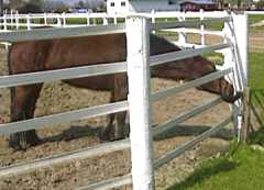 Today was mostly review. Patience got some arena time with CJ where they played hard. When Cindy arrived they were both still in the arena. Patience came up to Cindy who was getting pretty good with the click cues. The next thing we knew, Cindy was leading Patience around the ranch. Cindy groomed Patience in the round corral, for the most part with the lead rope draped over Patience's back. Patience was for the most part a perfect lady. Then it was worming time. I wish all my horses would take a dose of wormer as easily as Patience did. We probed around various touchy areas, in her mouth, up her nostrils, under her tail. She'd be no problem for a vet to examine her. We know these mustangs are pretty sharp mentally, but we still can't get over her clear headed approach to virtually everything we present to her. Day 15 Sharon worked with Patience on yielding. We originally held off at first on these maneuvers because she was pretty wary and we wanted her solid at close quarters plus her feet werre terribly overgrown. Now she was definitely calm and needed to learn to yield to pressure. Sharon worked on backing and yielding at the shoulder using a combination of energy, body language and contact, reinforced with the clicker. Patience started to catch on pretty well, however she was a bit clumsy with her front feet, probably in part to the significant changes in length of toe since her two trims. All in all, however, it was a great set-up for the following day. |