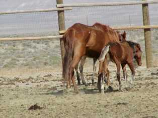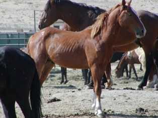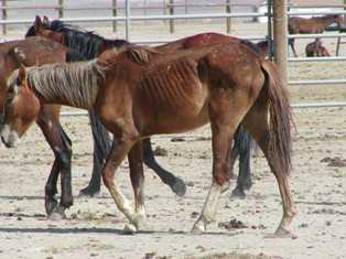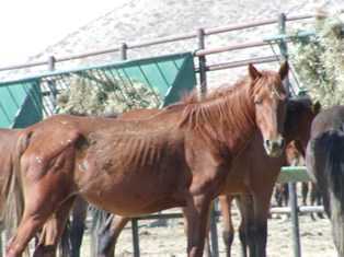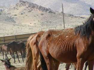Please note: We held off posting this story until we could authenticate the information that we are presenting. Two veterinary (DVM) pathologists, my daughter Cathy on the staff at the University of Oklahoma and Corrine Davis on the staff at Stanford University, assisted with facts, explanations and opinions. Salmonella is part of the environment in Nevada. It can be found in reptiles, some birds and in fecal matter from a variety of animals including horses and cattle. Nevada is the most arid state in the union and we are experiencing a significant drought year. Tom Gribbin from the Virginia Range Wildlife Protection Association and I rode out to the Carson River on September 29th and the river was bone dry. Although a few areas in the state have remained healthy, in countless areas the springs have dried up. Other springs are barely more than seeps. A number of streams are little more than a scattering of vernal pools in low places where what little water that is seeping through sand and gravel can see daylight. Horses often have to paw out seeps to get enough water to drink. Horses walk through fecal matter. All sorts of animals poop near water sources. It doesn't take a rocket scientist to figure out that salmonella is going to be in great supply in many places this year. Salmonella is one of Nature's balancing organisms. When times are hard, salmonella is one of the means by which grazing animals are culled. The weakest die off. The fittest remain to propagate and they remain in fewer numbers which in turn helps the plant communities recover. It's a nasty business and Mother Nature is one mean mother. What is hard to quantify is how many horses die out on the range. The weaker ones are going to drop whether held in a facility or if left out on the range. This form of salmonella causes scours which dehydrates the infected animals and further propagates the bacteria. Dehydrated animals can't camp by the water holes as they have to range to find enough food. Dehydrated animals ranging for food have to have water. One can easily come to the logical conclusion that salmonella is going to kill weaker horses. We see dead horses out on the range. Usually we find a leg here, a skull there, as the coyotes each pull off a piece and drag it away to eat in peace. Sometimes we can match parts to a single animal. Other times things aren't so clear. My point is that in a facility it's easy to count the sick and dead. Out on a remote range it is a lot harder to accurately calculate horse losses. Hundreds of horses die each year on the range due to natural causes and we don't see the carcasses piled up. Nature's cleaning crews take care of the bodies. BLM brought in around 1,000 head from the Jackson Mountains and according to both BLM and private observers the horses were in pretty poor condition. (Please see the representative photos on the right.) BLM put the horses on grass hay which according to both our experience and veterinarians whom we trust is the appropriate feed for "intake" horses. Healthy horses will adapt appropriately to this feed with minimal side effects unless they are significantly debilitated and/or come into the facility with high levels of harmful bacteria in their guts. What we cannot know is how many horses would have died if the entire gather had been left out on the range. It is possible that current range conditions could have produced a cataclysmic die off. Although it is probable that the stronger individuals would have survived on the range, the total number of range casualties could have greatly exceeded the 125 or so head that died from salmonella in the corrals. Horses have a symbiotic relationship with the range. They originally evolved here. One way or another the populations will decline during harsh conditions, either by migrating or by dying off. I suppose the question boils down to whether we let Nature or the BLM regulate the numbers. Due to man made obstacles many horses no longer have the ability to migrate out of an over-stressed range into better grazing areas so that they can remain healthy and so the stressed ranges can recover. Ergo I think we're stuck with human intervention as the solution. The range has to recover in order to support healthy horses and having sick horses competing for shrinking resources and spreading more disease is far from the best solution. For me the argument isn't whether wild herds have to be managed, but that they be managed as an established component of our multiple use policy of our public lands and that such management is based on sound science, follows established laws and is not skewed by political or corporate interests. Based on the generally agreed upon condition of the horses, the Jackson Mountains gather was appropriate under the circumstances and BLM followed appropriate management practices while intaking the horses. Another issue involves foals that had to be separated from their dams. Some foals have been Fostered out to competent and experienced caregivers and there is still capacity available among qualified caregivers should BLM find itself with additional foals that need more personal supervision and/or nursing. Finally, BLM is used to sanitizing its facilities when a problem like this arises. In fact PVC is "emptied" at least once a year for a general sanitizing before fall gathers start and new horses are brought in. Sick horses are not going to be shipped to other facilities and operators such as Cattoors know the importance of sanitizing their transports of fecal matter that could contain high bacterial content. Such is not only the most appropriate veterinary practice, but BLM can't meet its objectives if another salmonella outbreak results from an overly casual approach to dealing with this problem. Contractors like Cattoors gather and haul a lot of privately owned stock. They certainly can't risk getting a reputation of being sloppy and unnecessarily exposing stock to serious diseases so I expect th