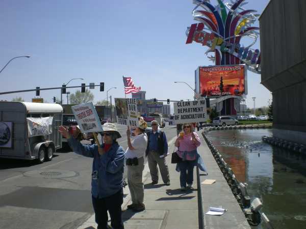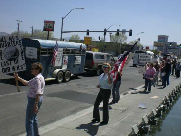 On a particularly beautiful April day about 20 advocates assembled outside the Nevada Republican Convention in Reno to protest plans by the Nevada Department of Agriculture to remove a historic herd of horses from the Virginia Range near Virginia City, NV. Advocates carried signs and a number of horse trailers circled the convention venue decked out with flags and signs with the theme, "No Death Row Horses."