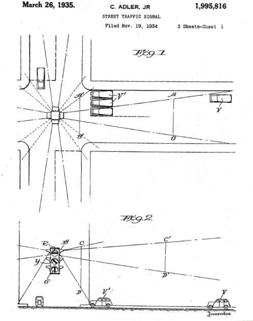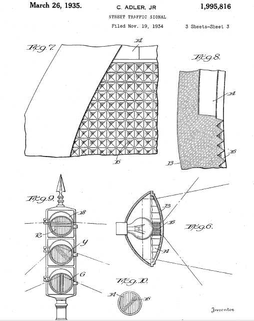 | Charles Adler, Jr. invented traffic control devices as early as 1928, designing such things as lenses that were improved for that time, fail safe illumination, reliable control mechanisms and even an early traffic actuated signal that changed when a driver at a red light honked a horn.  Perhaps his best known invention was his "bar" lens, designed in 1934 to assist color blind drivers.