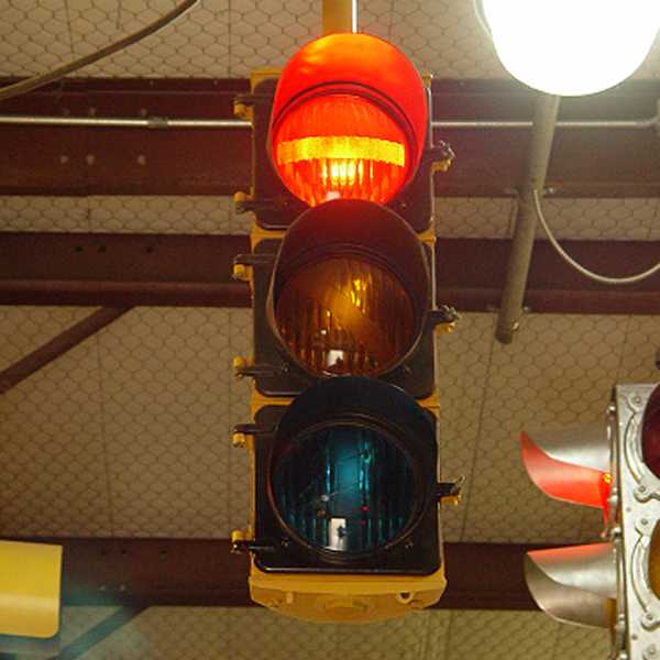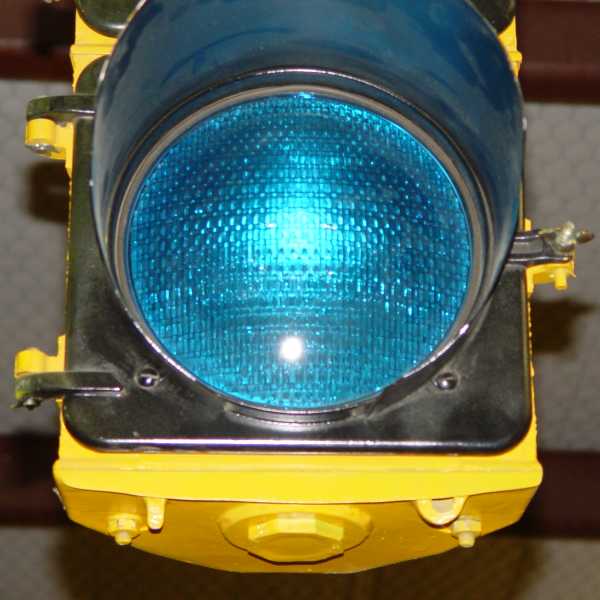 | The red and yellow lenses in this signal are Adler bar lenses.  Charles Adler, Jr. produced and patented three lens styles in 1934 designed to aid color blind people.  The red lens had a horizontal bar, the yellow lens a diagonal bar and the green lens a vertical bar.  (At the time some signals had red on the top and green on the bottom while other signals had green on the top and red on the bottom.  This could be challenging to drivers with red-green colorblindness.)  Learn More About Adler Lenses.