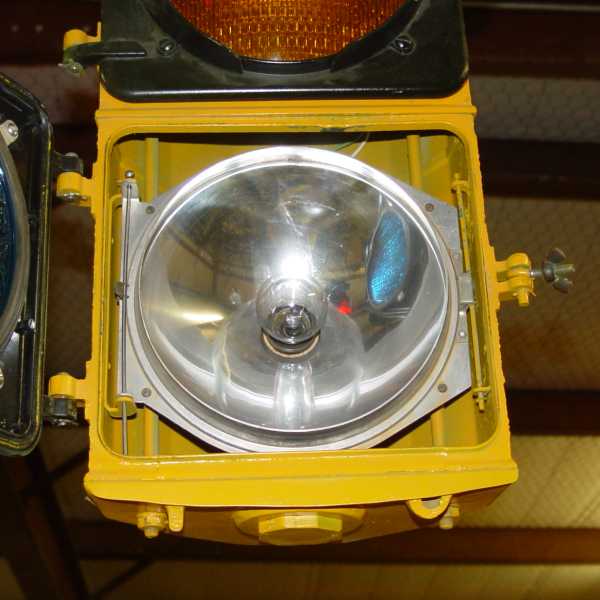 | Most reflectors were of Lancaster glass mirror type.  This particular light came with polished aluminum reflectors.  Each reflector frame hangs from a thin tension rod.  The reflector latches to another thin tension rod.  This design allows the reflector to be suspended slightly forward.  When the signal door closes, the lens gasket pushes slightly against the reflector, the pressure is taken up by slight flexion in the rods and a dust tight seal is maintained.