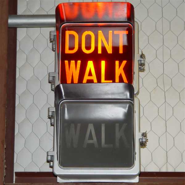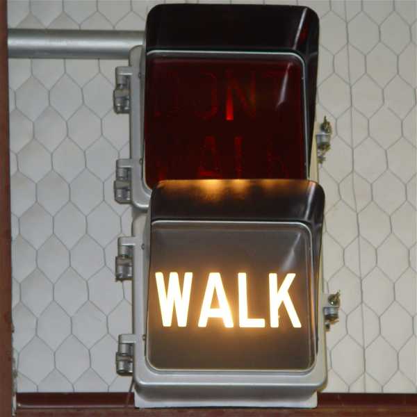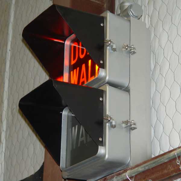 This Eagle 9-inch lettered pedestrian signal was manufactured after WAIT - WALK pedestrian signals were being phased out (when it was decided that "WAIT" looked too much like "WALK" from across the street) but before the hand - walking man symbols became the standard for pedestrian signals. Several manufacturers made lettered pedestrian signals that displayed Portland orange "DONT WALK" and lunar white "WALK" indications.