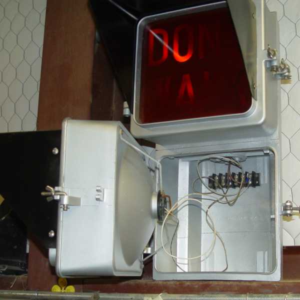 Eagle used it's standard flat back traffic signal housing for the pedestrian signal, and added an adapter section that held a rectangular polished aluminum reflector and to which the door and lens mounted. The signal had glass lettered lenses and it gave very clear indications to pedestrians. The design was easy service and to change bulbs.