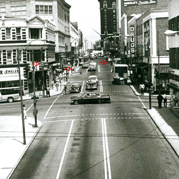 Here are some photos taken several years apart of the same intersection. These photos show the evolution from lamp post mounted porthole signals (shown above) to modern mast arm configurations.