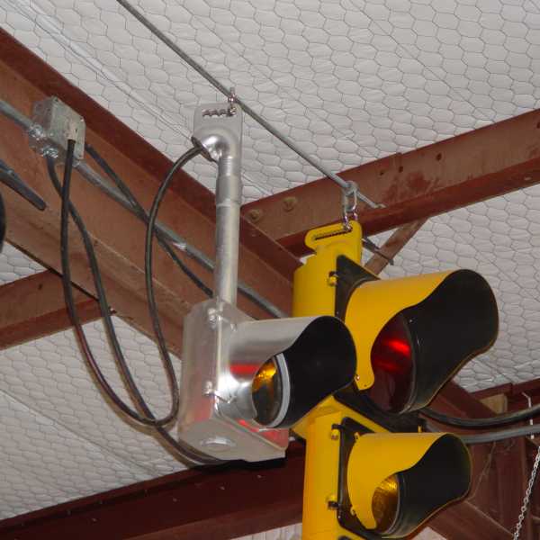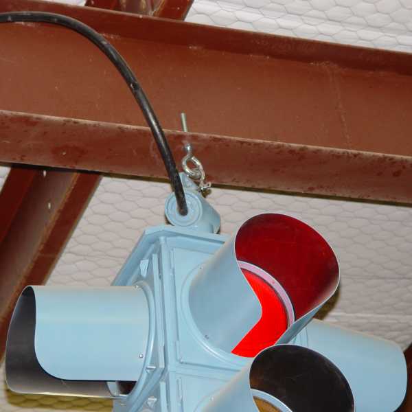 In some instances a short chain around a structural brace can be held together by a shackle, the bolt of which passes through the hanger on the signal gooseneck. |
