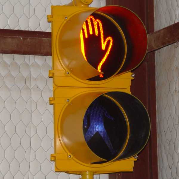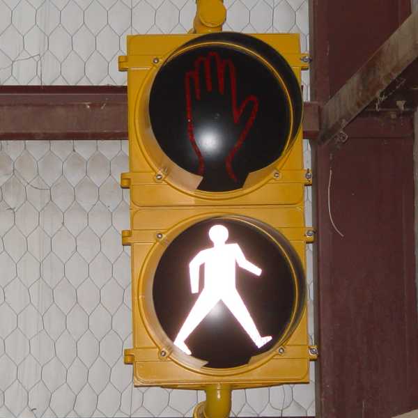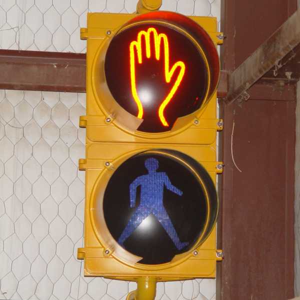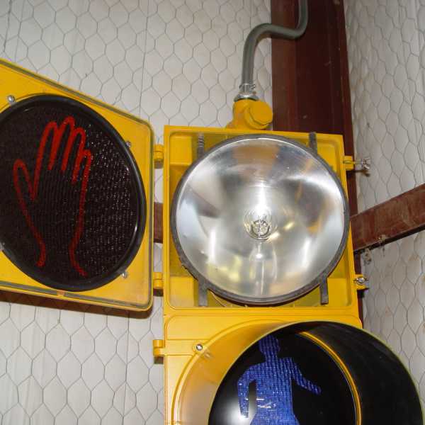 Twelve inch round pedestrian signals were not very common and raised hand and walking man round pedestrian signals were even more rare. The hand / man design came into use about the same time as pedestrian signal lenses became square or slightly rectangular in shape. Nonetheless there were a few round raised hand, walking man pedestrian signals made and one of them is displayed here.