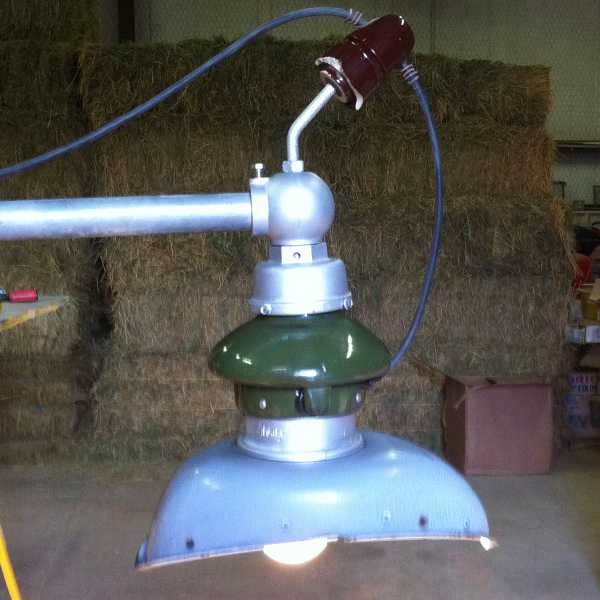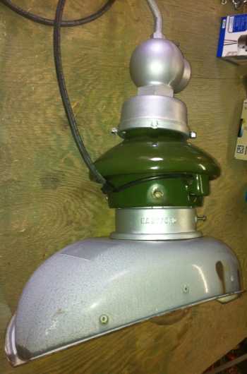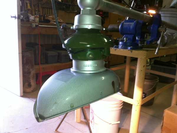 The bracket arm fitting is a slip type with a binding bolt. It also has the insulator for the feed conductor. The crown is cast iron and the body porcelain. The reflector fits to a cast collar. The collar is secured by machine screws but the reflector is held in place by clips so that it can be rotated and secured in any direction. |