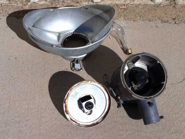 This luminaire was the last working incandescent street lamp from the village of Mt. Kisco, NY. Finding an original incandescent SO lamp was a bit unusual since many were converted to 100-watt mercury vapor. This lamp was in good enough condition to go back into service for area lighting. The reflector design minimized "stray" lighting and helped preserve "dark skies." |