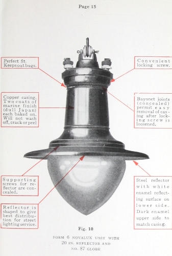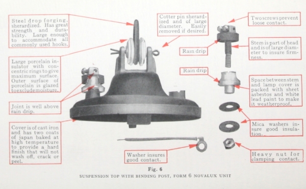 ![]() This particular refractor has Rolph sighting marks which makes this lamp either 1931 or newer vintage or an early 20th century luminaire for which the original refractor was broken and later replaced with a post 1931 version of the refractor. Since by the 1930s copper bodied autotransformer models had pretty much given way to porcelain body fixtures equipped with Jones sockets and film cutout disks, it stands to reason that this is likely an earlier vintage luminaire with a replacement refractor.