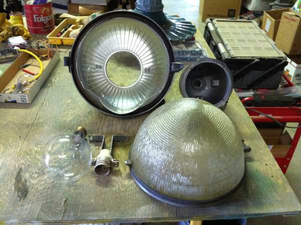 While many bowl globes were manufactured by Holophane, a great number were also made by Gleason-Tibeout Glass and some were made by Corning. This particular globe is a Corning 2-way refractor, GE's glass Form 500. |