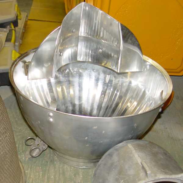 Some reflectors on pole mounted street lights had an additional aluminum blade called a deflector that dropped down on one side inside the refractor. This deflector directed light away from houses located behind the street light and towards the roadway. This particular light was for a center of street application and had no interior deflector.