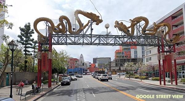 Although Los Angeles' Chinatown sidewalk lamps aren't as elaborate as San Francisco's are, they are still adorned with gold dragons. On the other hand, the entrance to Chinatown is definitely impressive.
