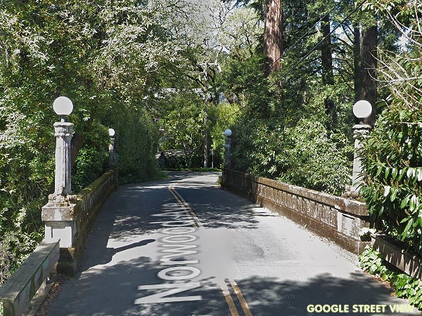 Opal glass globes guard this single lane bridge, approx. 1929. (San Anselmo Creek Bridge, Canyon Road)