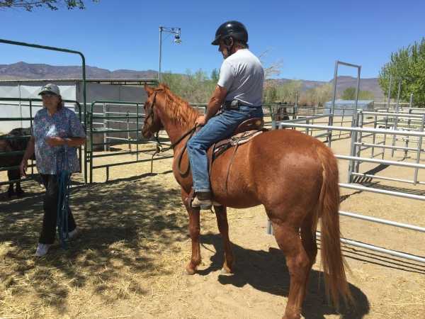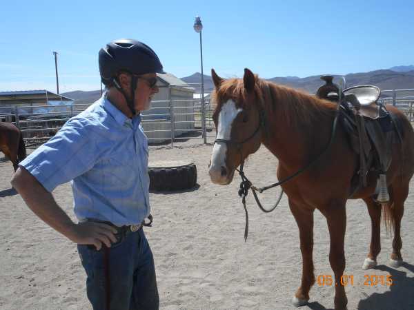 Performing a "pre-flight check" before sitting in the saddle. (Horse's second time being saddled.)
