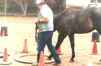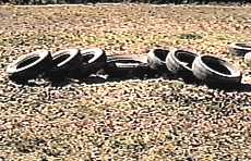 We also have some flat rounds made from sidewalls (which we cut from tires we were making into feeders). By lining these up, the horse can get used to the look of the "rings" and build confidence before attempting the "real tire". ![]() We also use an old auto tire, tied to a worn out lariat, as a drag obstacle. Most horses will get upset dragging the tire at first and this event needs to be set up carefully for the first time. However when out in the bush, one never knows when it might be necessary to use the horse to help move a downed tree from the trail, etc. Even if the horse is never used for such a utilitarian purpose, he should be comfortable with dragging objects following him or rustling nearby. Note: When working around any obstacles, you need to pay careful attention to your situation, your horse, any distractions and what others nearby are doing (what impact they may have on you and what impact you may have on them). Some horses may react unpredictably and you need to be prepared to guide them through any situation... or get competent assistance if you are not sure how to do so! (More obstacle examples are being prepared.) Also, if you have any obstacle ideas you'd like to share or see, email us! Continue to