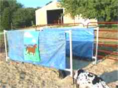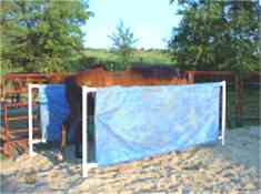 The squeeze box is another version of Game #7 the squeeze game. Instead of having the horse move between you and a wall, the horse moves between two walls, that move on their own with the wind. This obstacle was the hardest for my horse. What made it hard for him was that the walls, which are plastic tarp move and make noise when he passes through, he was convince it was going to collapse on him. I had to use treats to bribe him into the chute, but once in it he would race out the other end. It took a long time to get him to walk through quietly or to stand quiet in the center of it. I ended up putting grain on the ground in several places in the chute and leaving him loose in the round pen. He learned if he wanted the grain, he would have to learn to deal with his fear of the moving walls while he eat. It worked he learned to overcome his fear and I can now ride him through the walls, stop and backup etc.