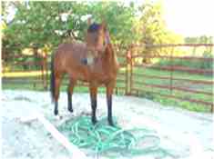 The purpose of this obstacle is to get the horse use to having his feet get caught up in something, and staying calm. I placed several sprinkler hoses, the ones with all the little holes in them, they are flatter then a regular hose and if a hole gets ripped in one, it doesn't matter, its just one more hole. They are placed all tangled up together on the ground. When a horse walks through them they bounce up and hit his leg, there are loops that he can get his hoof stuck in, which means he could drag some hose along for a while. When he does get stuck, he needs to learn to stop and stand till I remove the hose from around his leg. The hoses are thick enough so they should not cause any harm if the horse does panic. I never let a horse rush through this, he must learn to take one step at a time, stop, take a step etc. When he is calm with going forward you can start backing him through it.
