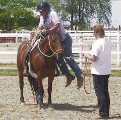 Similarly we need to know when to get off the horse. If the situation has reached a point that the rider is no longer confident that he/she can handle things, making an emergency dismount and landing on one's feet is preferable to having one's head planted into the ground like a lawn dart. Everyone needs to practice emergency dismounts, head toward the ground feet first, and be aware to direct their horse's head toward the side from which they are dismounting in order to encourage those hind feet to swing away toward the opposite side. Mecate reins are great because a rider can execute an emergency dismount and still have a chance of still holding onto the horse should the situation warrant it.