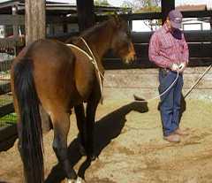 First I will let him get used to having the rope over his neck. Then I'll put the loop together. What I absolutely don't want is to emulate a cowboy with a rearing wild horse at the end of a rope.