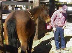 This entire sequence took about an hour. We may have to repeat it all over tomorrow and it may take nearly as long, or he may remain comfortable with being closely approached and I may have my hands on him in a couple of minutes. How that goes is up to Lucky and the amount of background stress that he is packing. The important issue is that we can make contact without generating a "flight or fight" response and the horse actually likes most of these encounters.