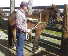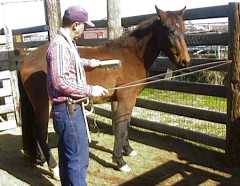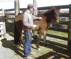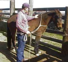 As one can see from the photographs, lucky stood to be brushed and to be rubbed by hand with nothing attached to him. (I did continue to hold the longe whip at first to keep his mind off the idea of creeping forward, but I eventually put it down.) The reader should note that while Lucky started forward and bumped into the whip a couple of times, I would simply stroke his nose with it and at no time did I ever strike him with it.