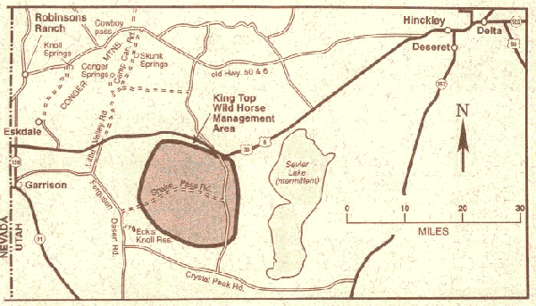 Travel west from Delta on US Highways 50 & 6 approximately 75 miles to Little Valley Road (milepost 16). Turn south at the intersection and travel 6 miles to the intersection of Ferguson Desert Road. Turn east on Ferguson Desert Road and travel for 12 miles to the turnoff on Probst Road (commonly known as Snake Pass Rd.) Turn east on Probst (Snake Pass) Rd. Horses may be encountered anywhere north or south along this road within the next 8 miles. Another good area to view King Top horses, particurlarly in the summer or late in the day, is in the vicinity of Eck's Knoll Reservior. This reservior is reached by continuing south from the Probst Pond sign on Ferguson Desert Road another 3 miles. At the fork in the road, take the left hand fork and travel 1½ miles to Eck's Knoll.